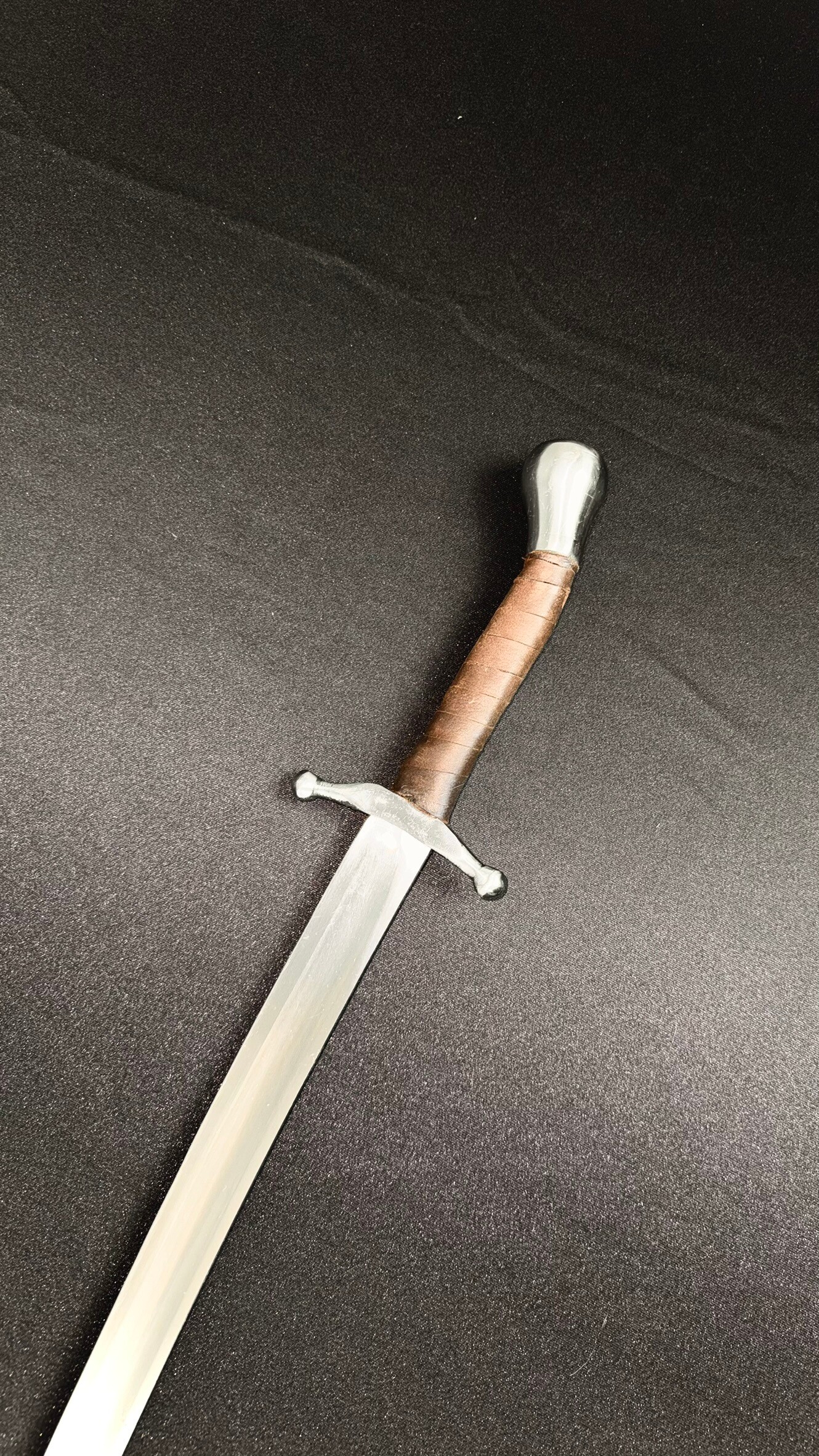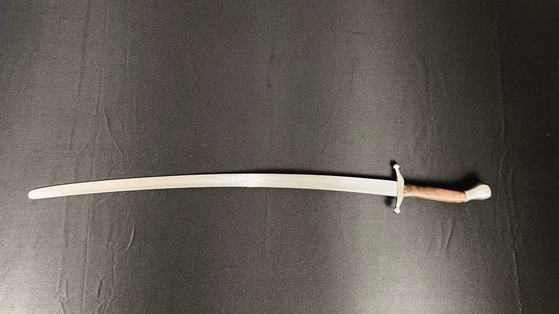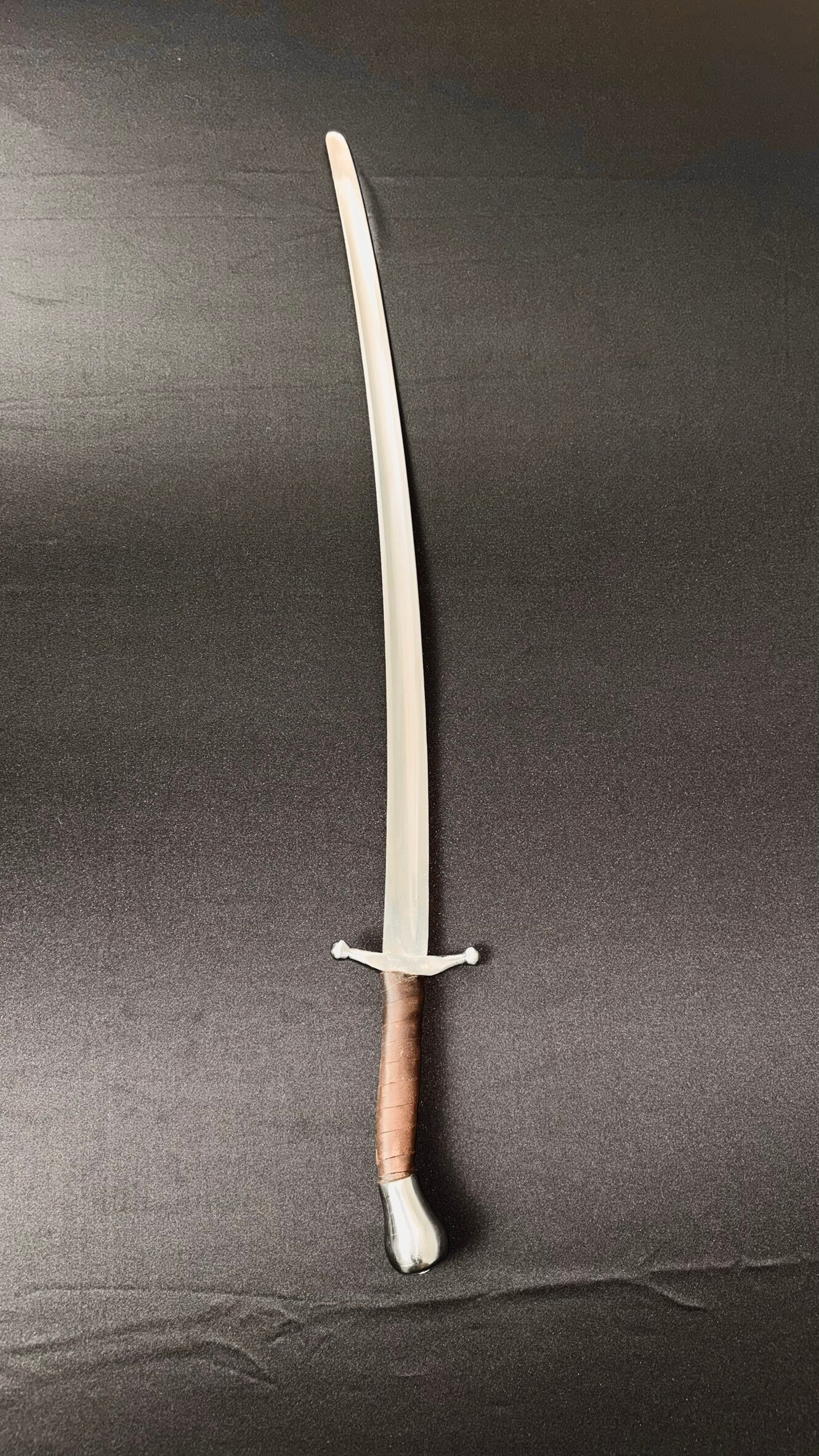 This saber is ready for combat use, with blunt edges and a rounded tip. It comes with a one-year warranty.