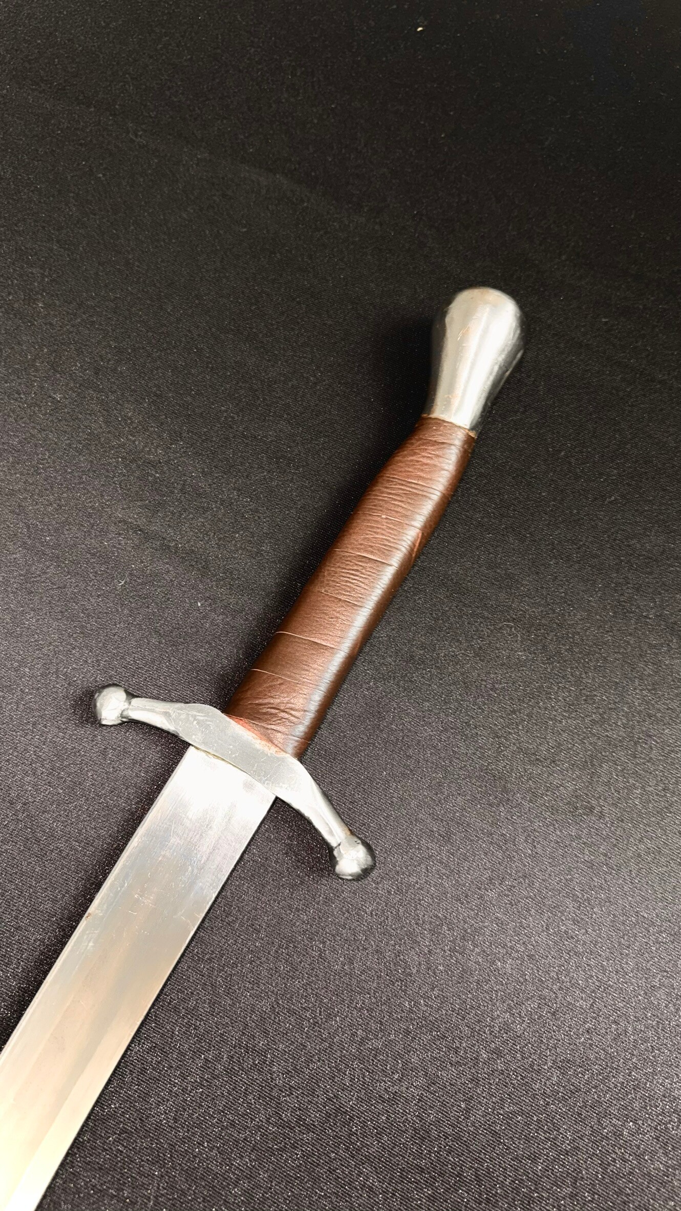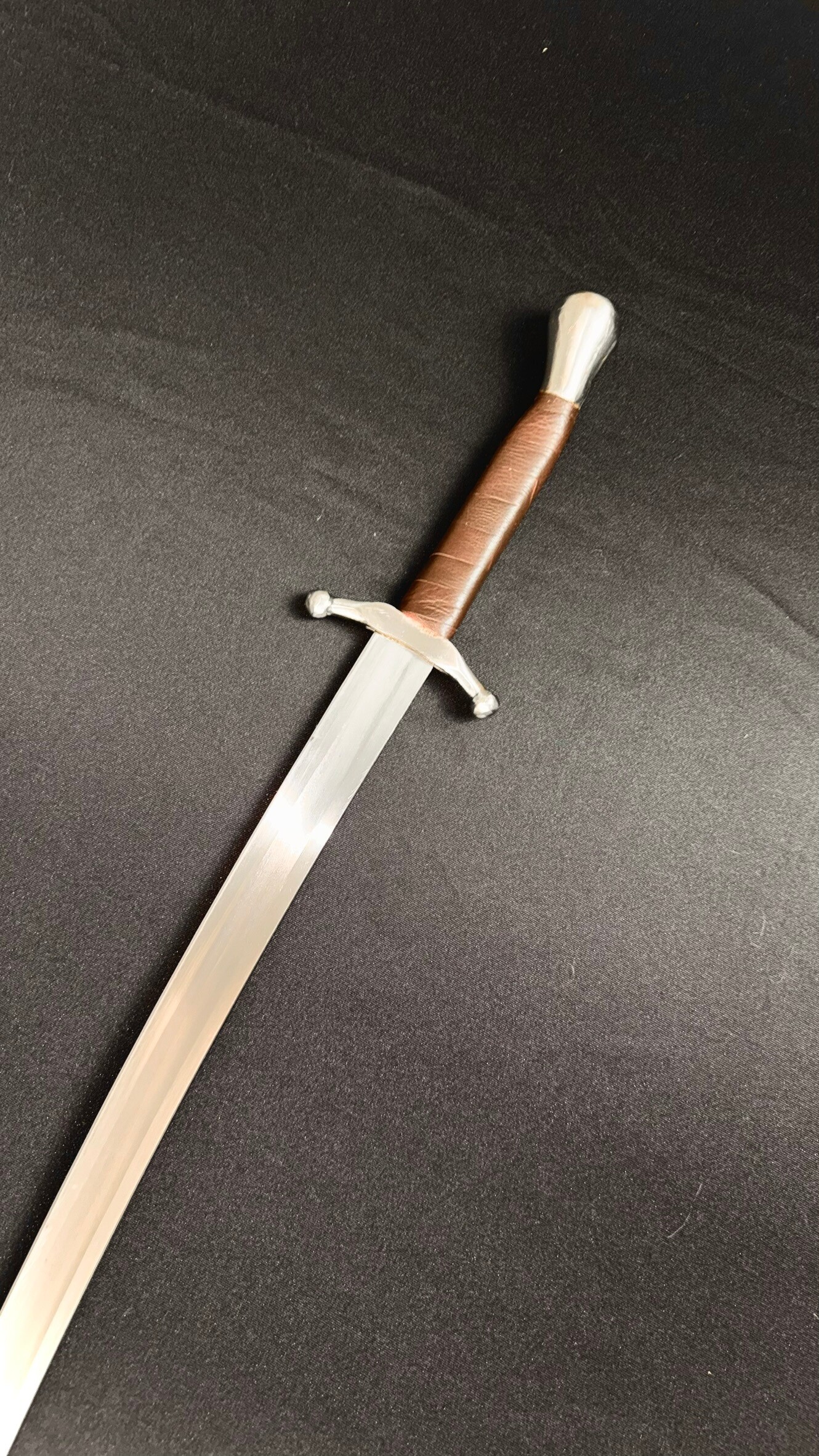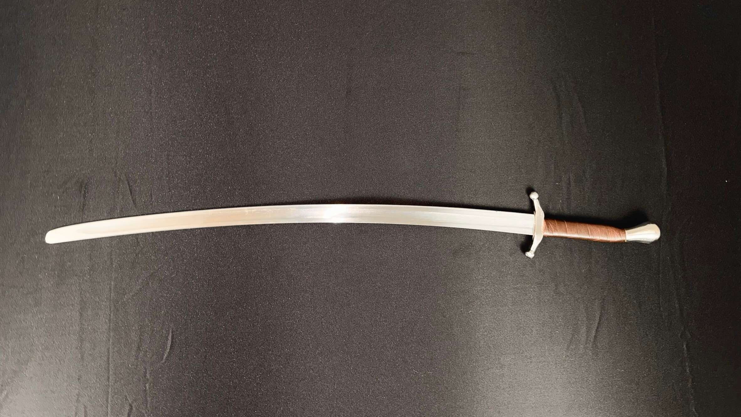 This saber is ready for combat use, with blunt edges and a rounded tip. It comes with a one-year warranty.