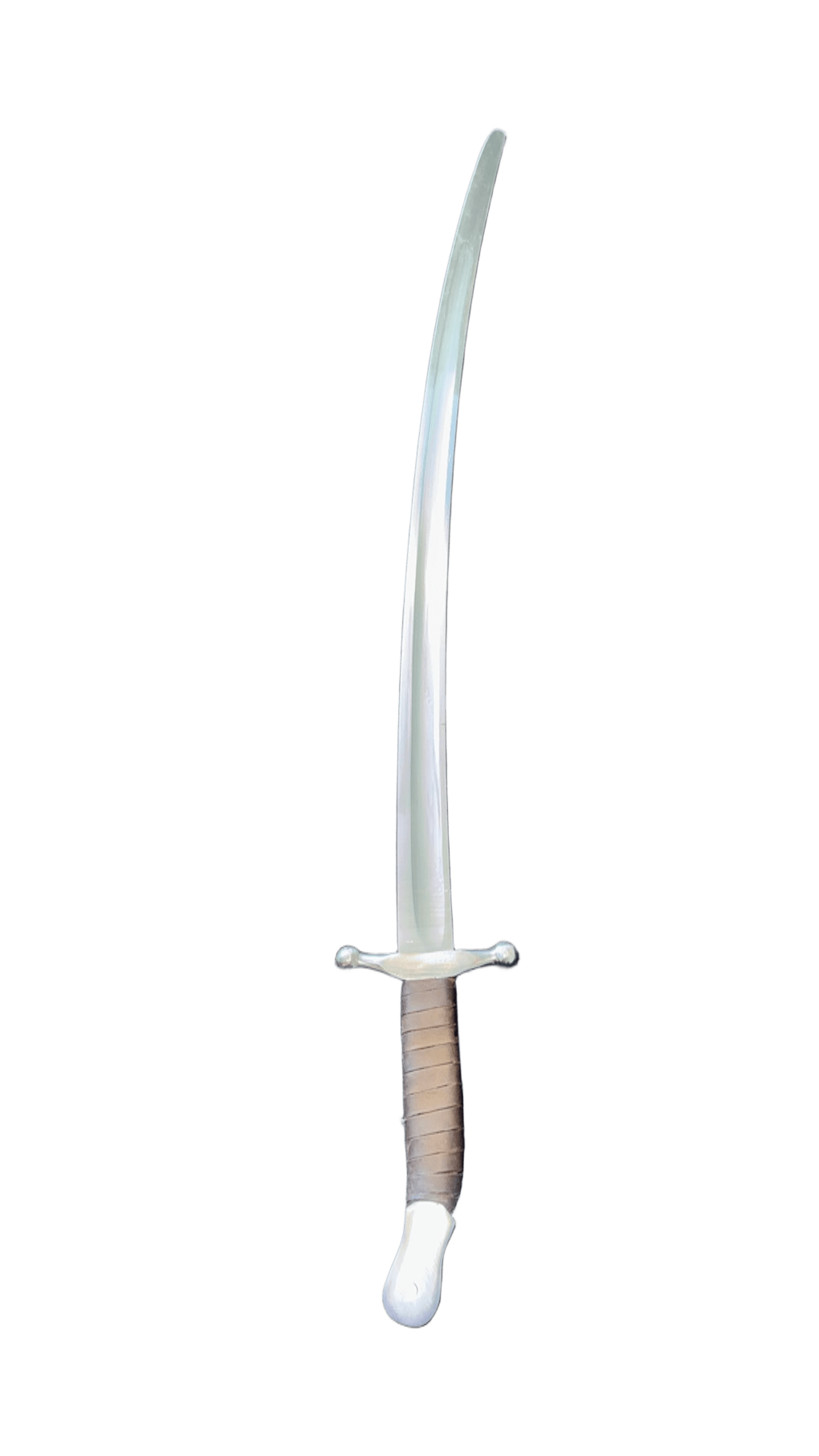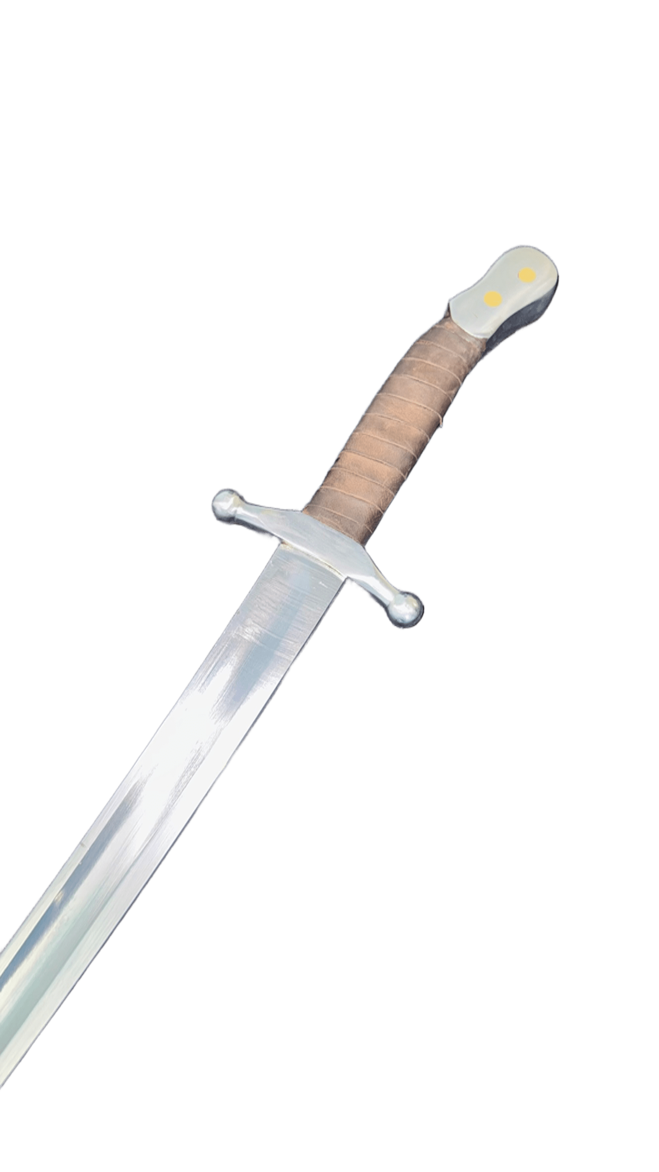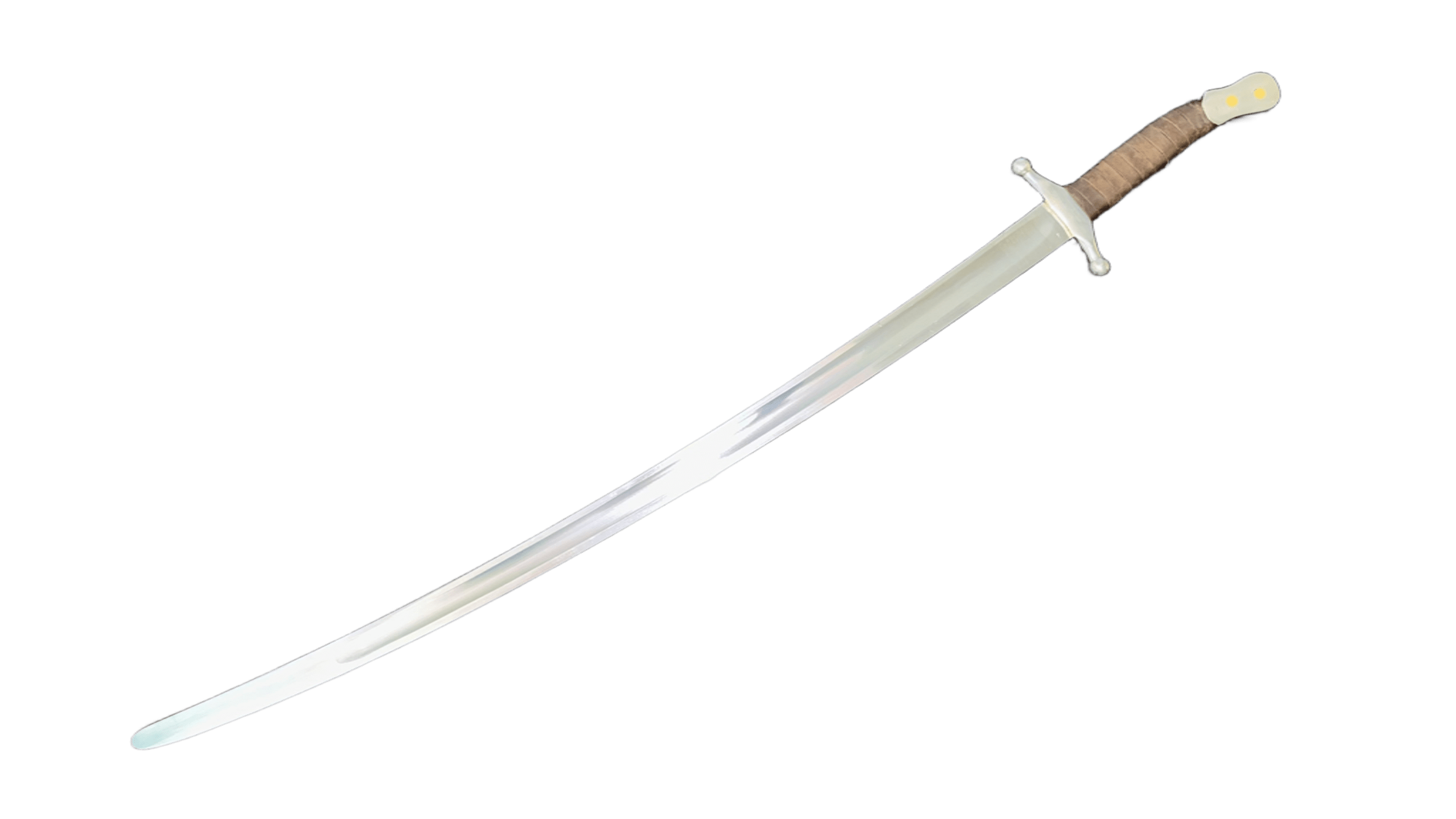 This saber is ready for combat use, with blunt edges and a rounded tip. It comes with a one-year warranty.