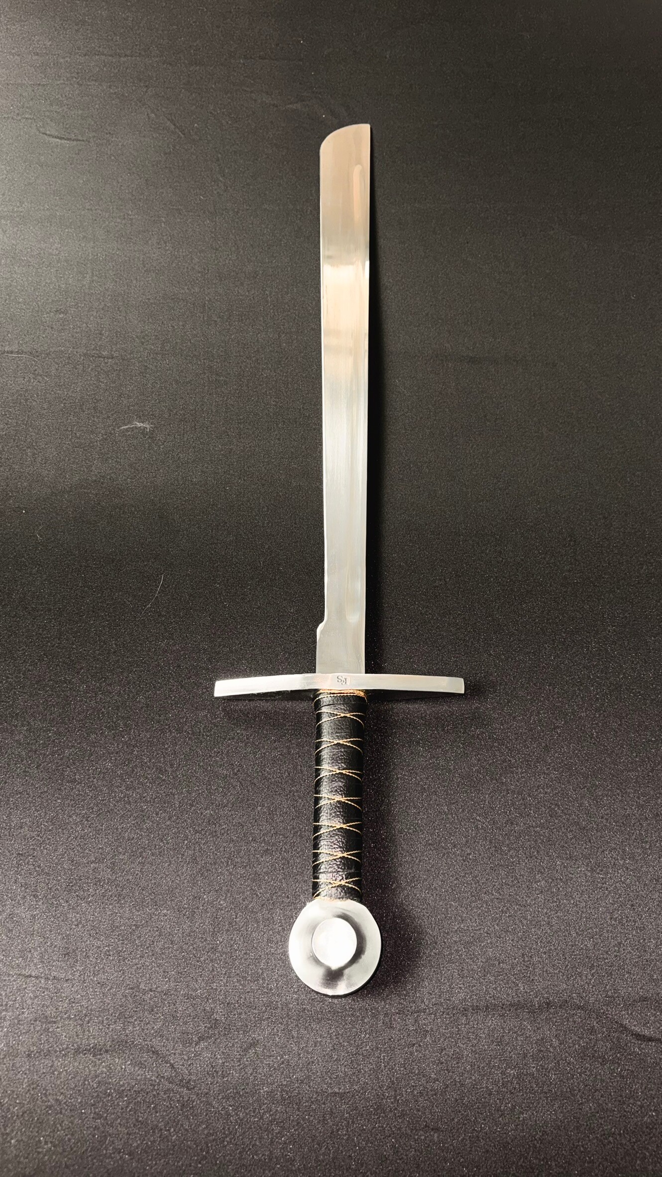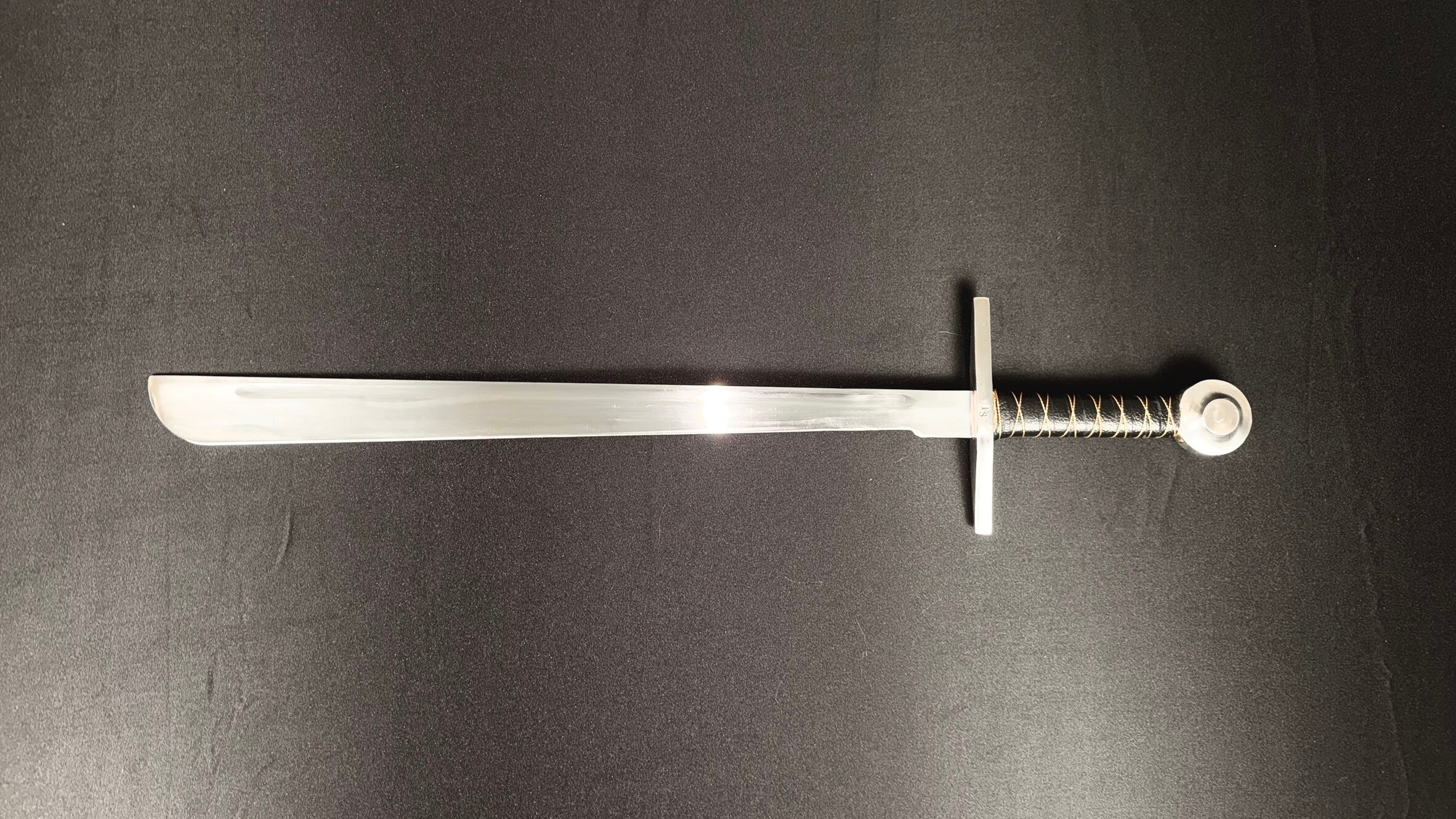 This sword is ready for combat use, with blunt edges and a rounded tip. It comes with a one-year warranty.