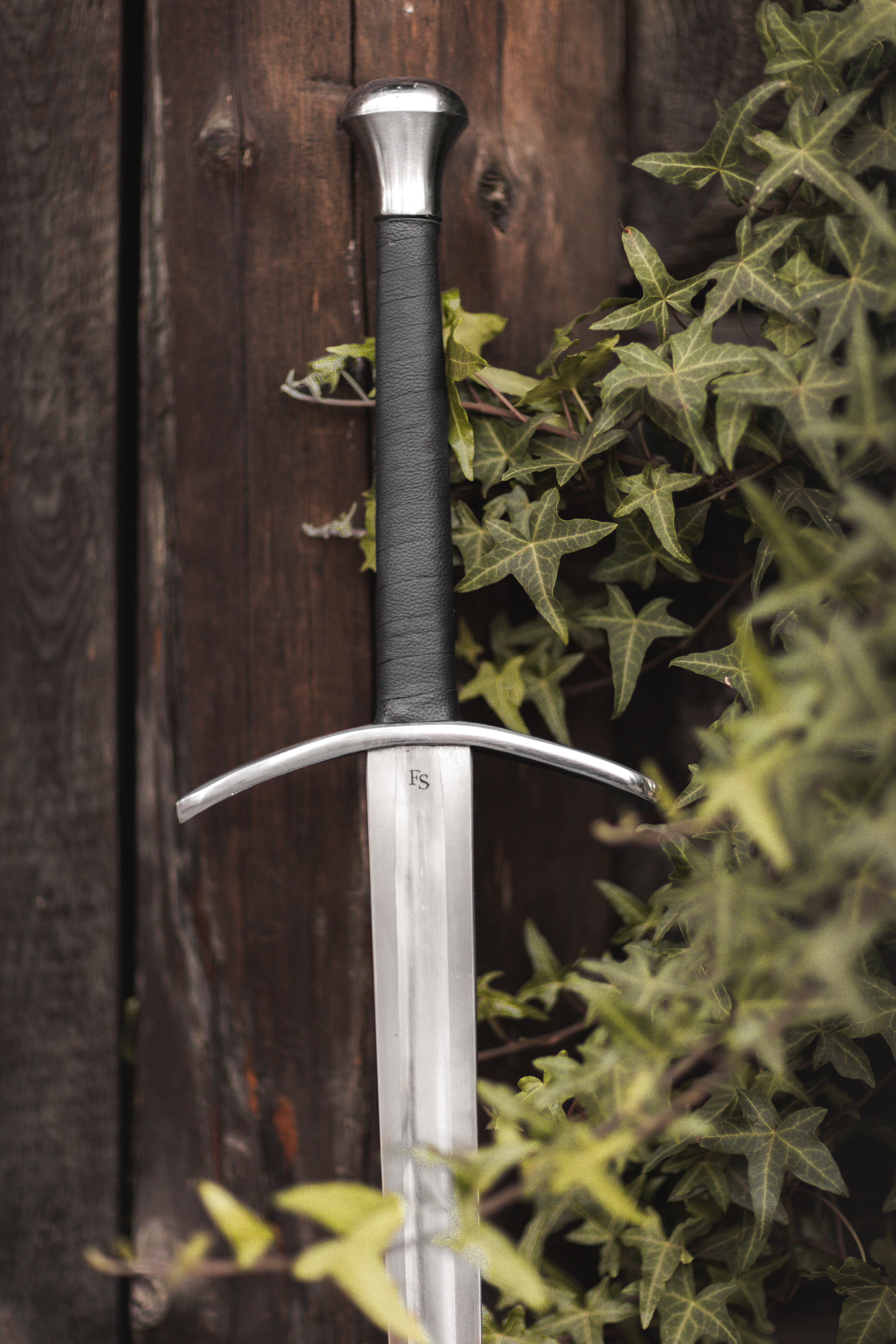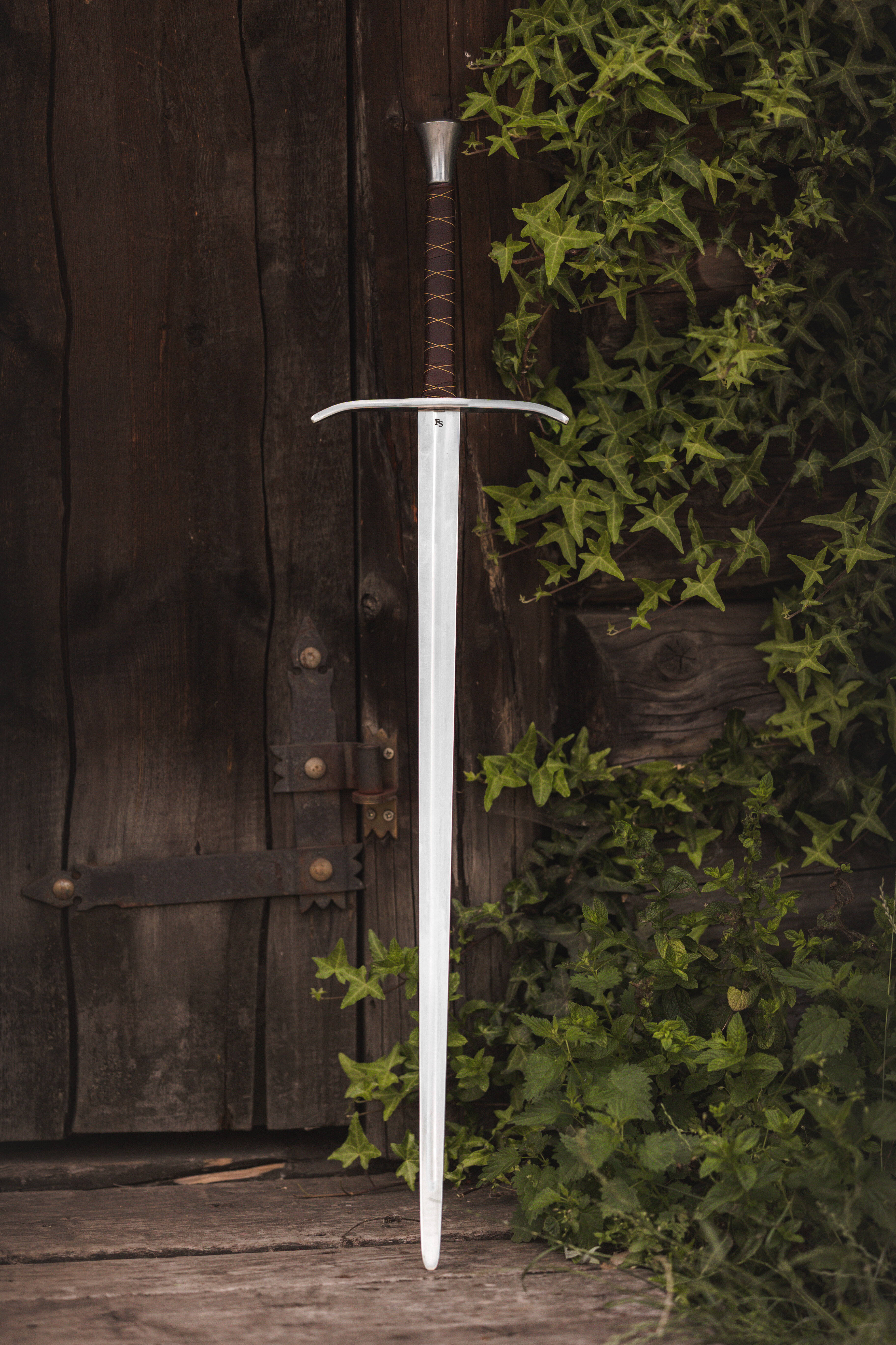 Our bastard sword stands out with its solid craftsmanship and attention to detail, adhering to historical patterns. Its longer blade and distinctive extended grip, allowing for a one-handed or two-handed hold, provide unmatched versatility in combat. This design allows for delivering both powerful, wide cuts and precise, thrusting jabs, making these swords incredibly effective against armored opponents. The subtly shaped crossguard and well-balanced pommel ensure excellent control over the weapon. The blade types of such swords (e.g., XII, XIIIa, XVa, XVI according to Oakeshott) feature varied profiles, from wide blades with grooves to more tapered ones with a strong point, ideal for piercing armor.